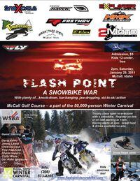 McCall, Idaho - The world's first snowbike race, Ground Zero, last took place at the 2009 McCall Winter Carnival in Idaho. Known as "Ground Zero," the event was a huge success, pulling in over 1,200 spectators and a number of national-caliber motorcycle racers, including former factory motocross champion, John Dowd, who wound up winning. A sour economy derailed the event in 2010, but at 2pm on January 29, 2011, the snowbike race, now known as Flash Point, will return to the 50,000-person McCall Winter Carnival. It will take place on the McCall Golf Course, just off of Main Street in McCall, Idaho and is expected to draw several thousand spectators and a number of participants from across the United States. Snowbiking is a relatively new form of winter recreation, where a ski and a lightweight, high-performance track are fitted to modern, off-road motorcycles. Snowbikes are easy to maneuver, and are up to 300 pounds lighter than a snowmobile. They are also much less expensive, and allow a dirt bike rider to quickly and easily convert his motorcycle for use in the winter.