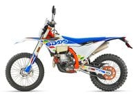 Appearance-wise, we find white hand guards, headlight, front fender, radiator shrouds, and side number plates along with blue fork guards and rear fender—all of which were orange on the 2025 model. Graphics are different from last year too.