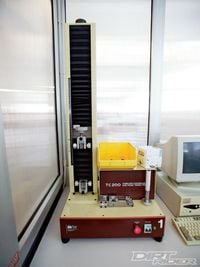 This machine stretches the rubber to test its strength and elasticity.