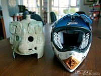 Helmets have come a long way in the last 2,200 years. One of these is a current, custom-painted Progrip helmet, the other is a helmet from one of the 8,000 terra-cotta warriors discovered in an emperor's tomb in China. Luigi and Simone swore this was from one of the real terra-cotta warriors, but they were smiling an awful lot at the time.