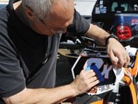 You won't get any kind of decal to stay in place if your not starting with a clean surface."First, when installing graphics on old plastic you want to remove the old decal and then you need to clean the plastic really well," advises Hayes. "Use a good brake cleaner to clean off any old glue, dirt, squirrels, dog hair, or anything that might be adhering to the plastic. We use Motorex brake cleaner.""New plastic is the toughest. You almost want the plastic to look dull after you've cleaned it. Alcohol will not work; soap will not work. You have to use something that's a solvent, only a good brake cleaner or solvent," insists Hayes.