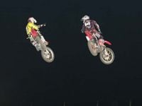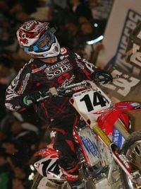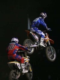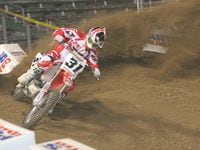 The second night of racing started with a sobering announcement that Jeremy McGrath's crash the night before was a little more serious than previously thought. It was discovered that McGrath actually fractured his C7 vertebra in two places. There was no spinal cord injury, there is no paralysis, but McGrath is still hospitalized. Sunday he will be moved to a hospital closer to his home. His release date has not been set, but he is in good spirits - so good that he wanted to attend the opening ceremonies, but doctor's orders kept him away. The crowd yelled out a collective, "Thank you, Showtime," before the program got underway. Get-well wishes can be sent directly to Jeremy at Jeremy@nacnac.com.The show went on without its leader, and McGrath would have been proud of the night of racing. Josh Grant looked fast and determined again in the timed practice. Windham also looked just as he did the night before - fast and smooth. Travis, also in a repeat of the night before, alternated between fast laps and sight laps.Unfortunately, Nick Wey went down hard. He was slow to get up, shaky on his feet once he had them under him, and was holding his left arm. He left the stadium on the Asterisk medical cart.The freestylers were back again, and dazzled the crowd with amazing tricks off both their mobile ramps and the two metal ramps on the track. Travis Pastrana and Nate Adams took advantage of the track's five-wide metal ramps and did sets of side-by-side back flips for the crowd.The racers took the track back for an eight lap heat to determine the gate pick for the moto at the end of the night. Windham and Cole Siebler were both out front in the first corner, but Windham quickly took control of the race and lead the pack around. While still bunched tight, Josh Grant collided with David Vuillemin landing through a rhythm section. Grant stayed up, but Vuillemin went down and did not finish the race. It would be the first shot fired in a new rivalry.The focus of the rest of the heat was Josh Grant's charge from mid-pack into second. Apparently there was a mix-up in the pits and someone forgot to tell Josh Grant that he was down on power and shouldn't be able to pass 450 riders with such ease. Grant revved, finessed, and charged his way into second, where he pulled a comfortable gap over Jason Thomas. Kevin Windham, meantime, was quietly out front doing the only thing he was able to do up to that point all weekend - win.Then the one-on-one elimination racing began. Two riders, two laps, winner advances, loser watches from the stands (until the night's final all-rider moto).The elimination racing got interesting real fast. The second elimination race saw Chad Johnson and Jason Thomas make contact in the first corner. The very next race also saw first-corner banging with Heath Voss sliding a rear wheel into Cole Siebler. But then the fourth race of the night rolled around.