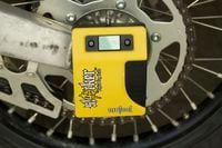 The whole kit includes the main unit that houses a hook-ended cable and reads the sag in millimeters, a clamp for your rear fender or numberplate, and a remote display and connector cord. You mount the main unit to your axle via a magnet that is so strong that when I went to unscrew the battery compartment lid, I had a hard time keeping my screwdriver away from the magnet. Then you attach the clamp to your bike, extend the retractable cable and hook it to the clamp, then hit the button on the main unit to zero the measurement. From there you simply take the bike off the stand, hop on, and read the display.