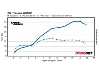 2021 marks the first time we have run a WR250F on the Dirt Rider dyno, so we were extra curious to see how the bLU cRU’s trail-focused 250 four-stroke would perform, especially in comparison to the YZ250F in spite of the different engine and ECU settings and mufflers between them. When all was said and done, the WR250F spun 36.1 hp at 12,000 rpm and 17.9 pound-feet of torque at 8,100 rpm, which is 2.9 less peak horsepower and only 0.1 less pound-feet of torque than the YZ250F at peak.