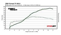 A lack of those features doesn’t inhibit the TF 450-X on Dirt Rider’s in-house Dynojet 250i rear-wheel dynamometer though. Triumph’s standard 450cc motocross bike produces impressive figures at the rear wheel with 55.7 hp and 32.9 lb.-ft. of torque, which is just 0.1 hp less and 0.8 lb.-ft. of torque more than the TF 450-RC Edition at peak.